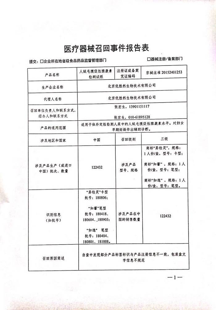 北京优胜然生物技术有限公司 报告,由于 自查中发现部分产品标签标识与产品注册信息不一致,包装盒文字信息不规范 的原因, 北京优胜然生物技术有限公司 对其生产的 人绒毛膜促性腺激素检测试纸(注册或备案号:京械注准20152401253)主动召回。召回级别为 三级 。涉及产品的型号、规格及批次等详细信息见《医疗器械召回事件报告表》。