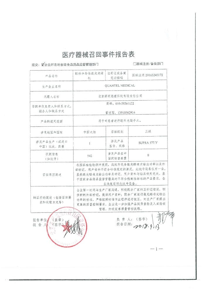 北京高视远望科技有限责任公司 报告,由于 在国家抽检检测中发现,此批号设备激光瞄准光输出功率以及外部标记、用户资料不符合标准规定的情况,此批号设备仅有一台,虽然激光瞄准光输出功率及标记、用户资料与临床使用无关,基于国家食品药品监督管理局对不符合强制性标准的产品要求,企业决定召回此批号设备。 的原因, QUANTEL MEDICAL 对其生产的 眼科半导体激光光凝机(注册或备案号:国械注进20163245172)主动召回。召回级别为 三级 。涉及产品的型号、规格及批次等详细信息见《医疗器械召回事件报告表》。