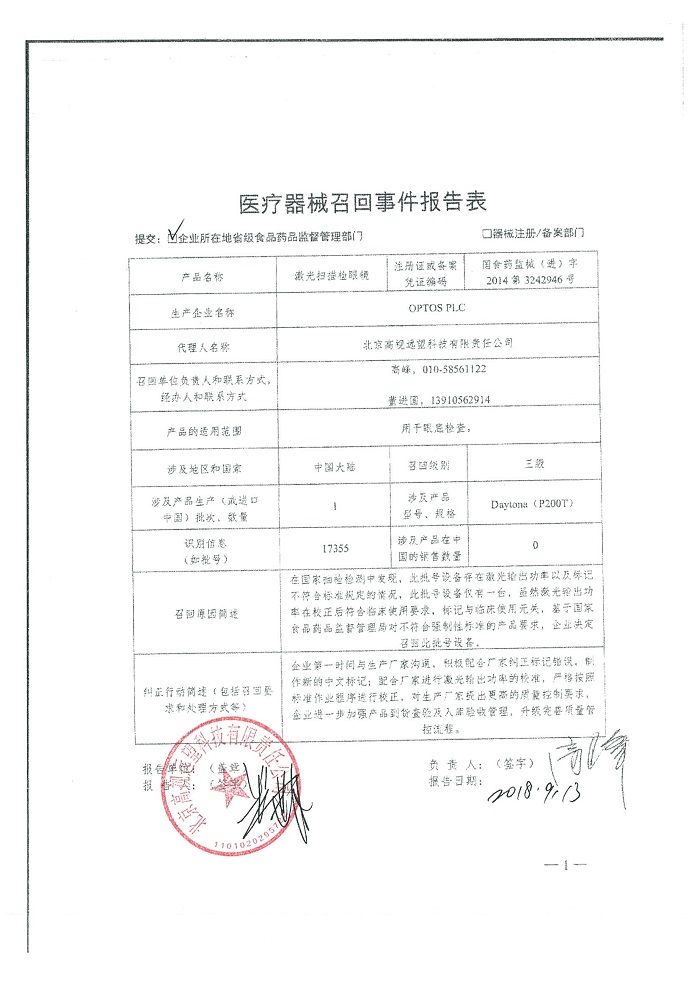北京高视远望科技有限责任公司 报告,由于 在国家抽检检测中发现,此批号设备存在激光输出功率以及标记不符合标准规定的情况,此批号设备仅有一台,虽然激光输出功率在校正后符合临床使用要求,标记与临床使用无关,基于国家药品监督管理局对不符合强制性标准的产品要求,企业决定召回此批号设备。 的原因, OPTOS PLC 对其生产的 激光扫描检眼镜(注册或备案号:国食药监械(进)字2014第3242946号)主动召回。召回级别为 三级 。涉及产品的型号、规格及批次等详细信息见《医疗器械召回事件报告表》。