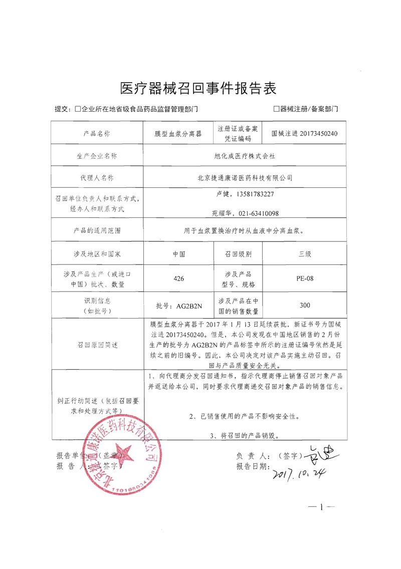 北京捷通康诺医药科技有限公司 报告,由于 膜型血浆分离器于2017年1月13日延续获批,新证书号为国械注进20173450240。本公司发现在中国地区销售的2月份生产的批号为AG2B2N的产品标签中所示的注册证编号依然是延续之前的旧编号的原因, 旭化成医疗株式会社 对其生产的 膜型血浆分离器(注册或备案号:国械注进20173450240)主动召回。召回级别为  三级 。涉及产品的型号、规格及批次等详细信息见《医疗器械召回事件报告表》。