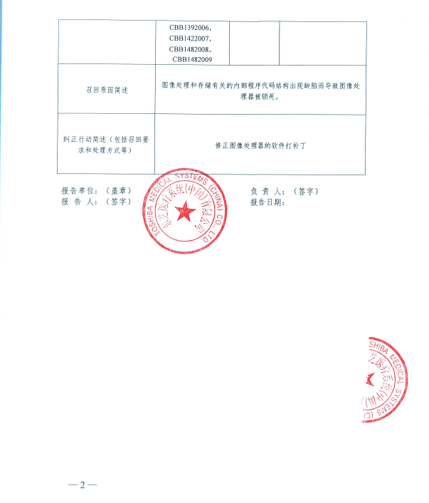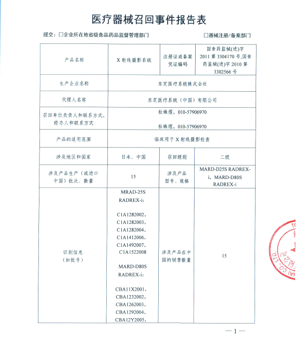 东芝医疗系统(中国)有限公司报告,由于 图像处理和存储有关的内部程序代码结构出现缺陷而导致图像处理器被锁死的原因, 东芝医疗系统株式会社 对其生产的 X射线摄影系统(注册或备案号:国食药监械(进)字2011第3304170号,国食药监械(进)字2010第3302566号)主动召回。召回级别为二级 。涉及产品的型号、规格及批次等详细信息见《医疗器械召回事件报告表》。