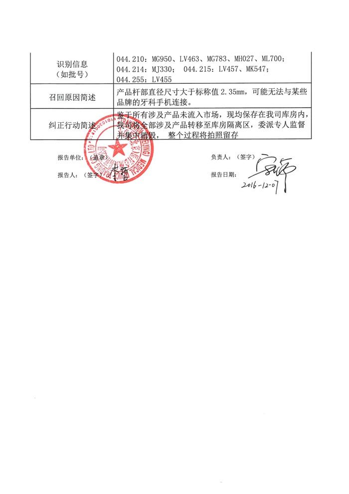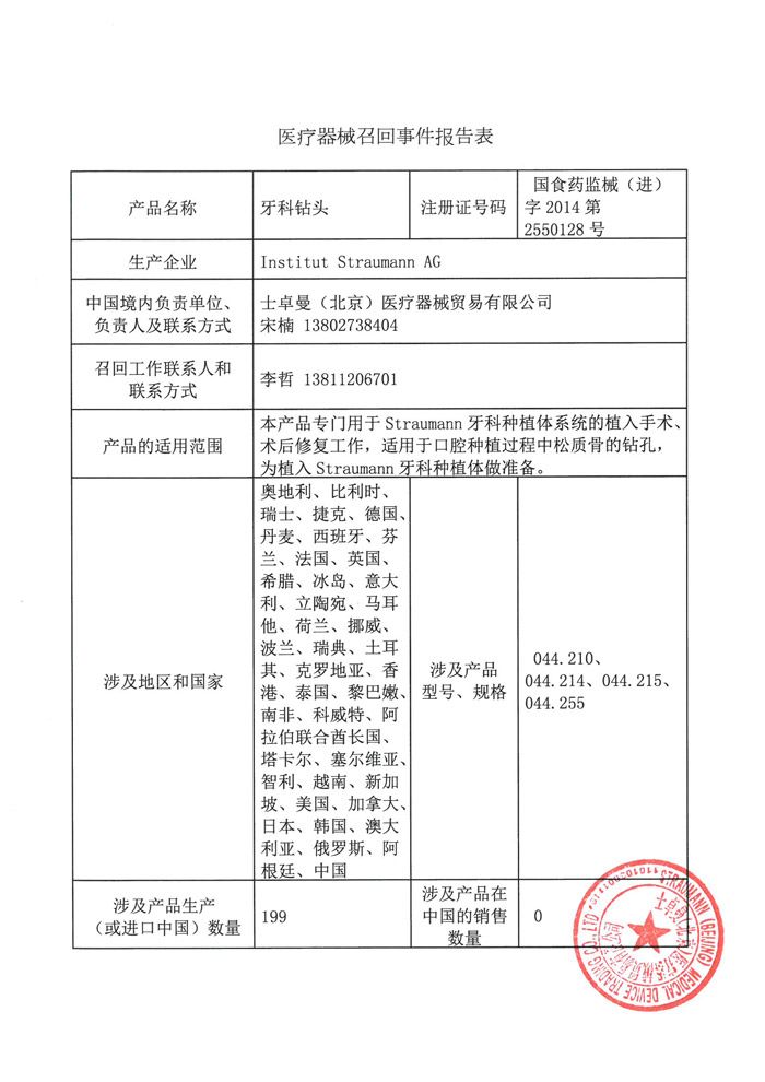士卓曼(北京)医疗器械贸易有限公司 报告,由于 产品杆部直径尺寸大于标称值2.35mm,可能无法与某些品牌的牙科手机连接原因, Institut Straumann AG 对其生产的 牙科钻头(注册或备案号:国食药监械(进)字2014第2550128号)主动召回。召回级别为 三级 。涉及产品的型号、规格及批次等详细信息见《医疗器械召回事件报告表》。