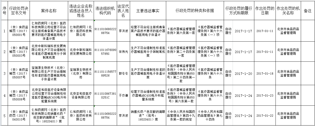 北京市食品药品监督管理局“双打”行政处罚案件信息公开表(2017年1月)