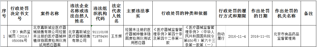 北京市食品药品监督管理局“双打”行政处罚案件信息公开表(2016年11月)
